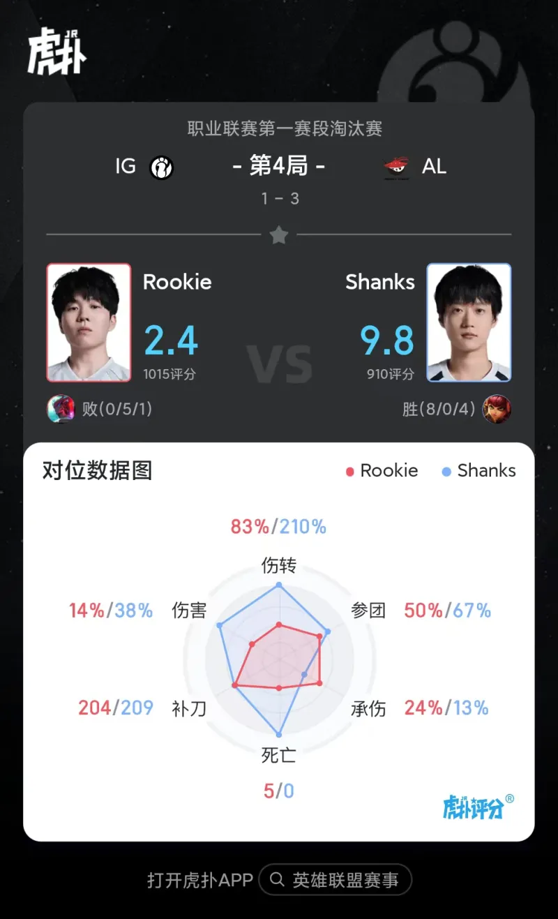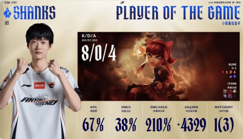 虎扑03月03日讯 Shanks安妮打出8/0/4战绩,拿到AL对阵IG第四局比赛MVP